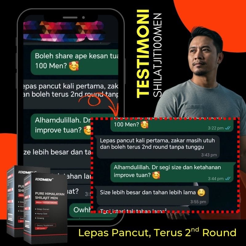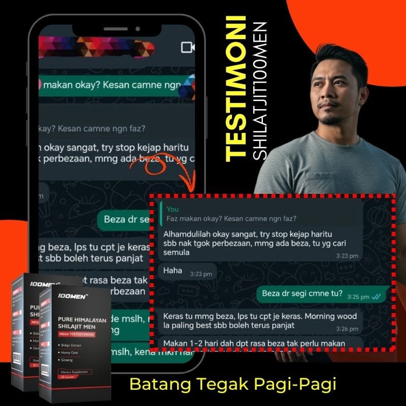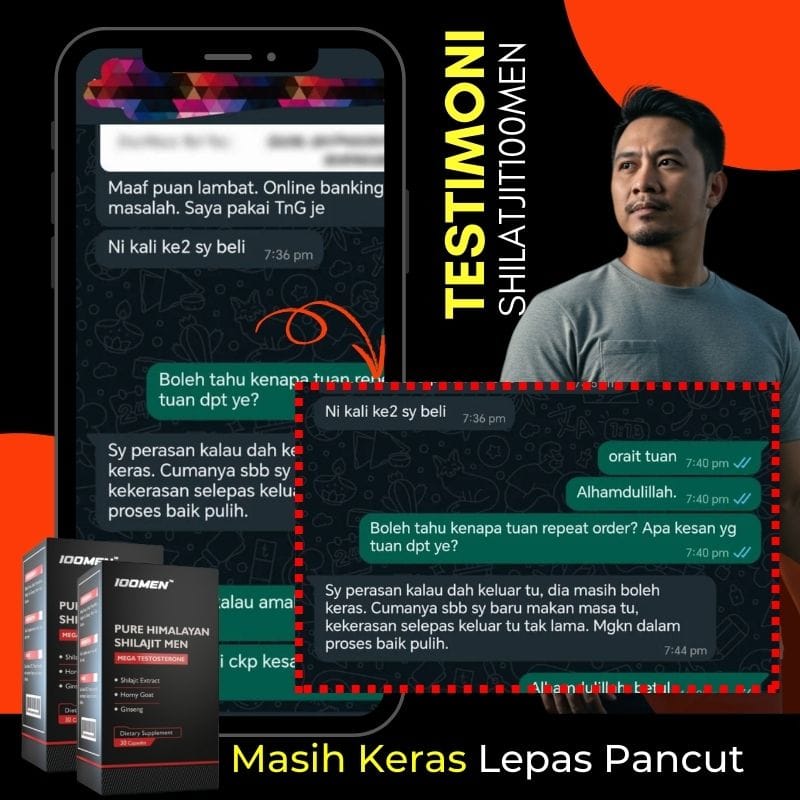 Saya dah biasa amalkan Shilajit100Men, tapi saja cuba berhenti sekejap sebab nak tengok beza. Memang ketara – tenaga menurun, zakar pun tak sekuat sebelum ni. Bila sambung semula, terus rasa keras lebih cepat dan pagi pun ada ‘morning wood’ semula. Best sebab kesan dia bukan sekadar sementara.