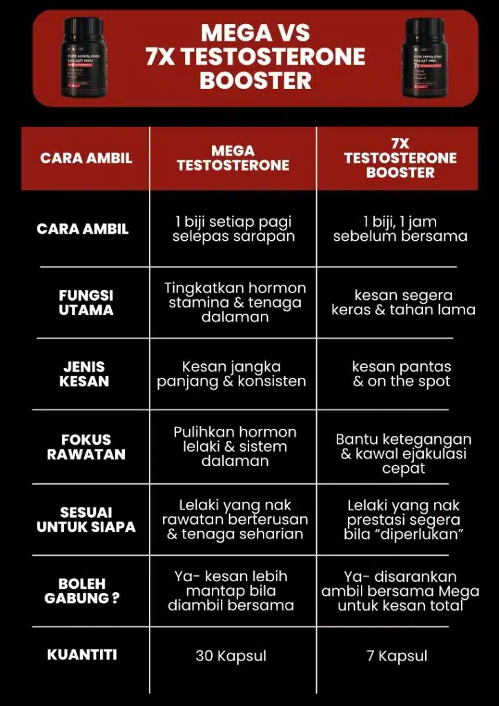 7X Booster beri kesan dalam masa 30–60 minit. Mega beri kesan stabil selepas 7–14 hari.